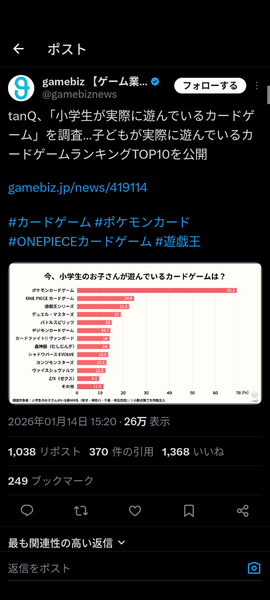 537: 2026/01/14(水) 22:06:53.34 ID:YrX0Aku70小学生めちゃくちゃ遊戯王やってるんだな548: 2026/01/14(水) 22:09:41.99 ID:edjiIL+nH>>537本当かよ···